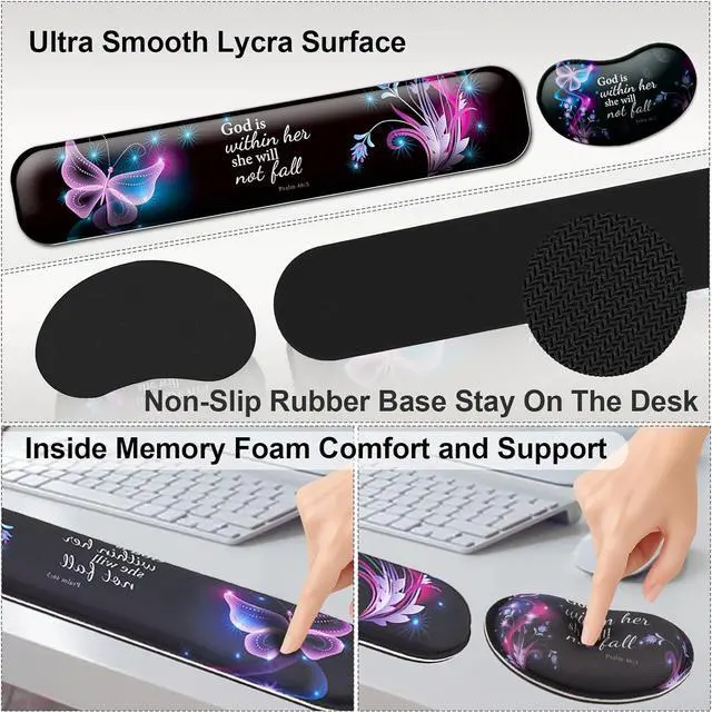 Non-slip Base: The bottom of the keyboard wrist adopts anti-skid rubber material. The bottom of the Mouse Wrist is with Semi-adhesive PU. They can be firmly fixed on the desktop to prevent sliding, also no fear of residue or trouble adjusting.