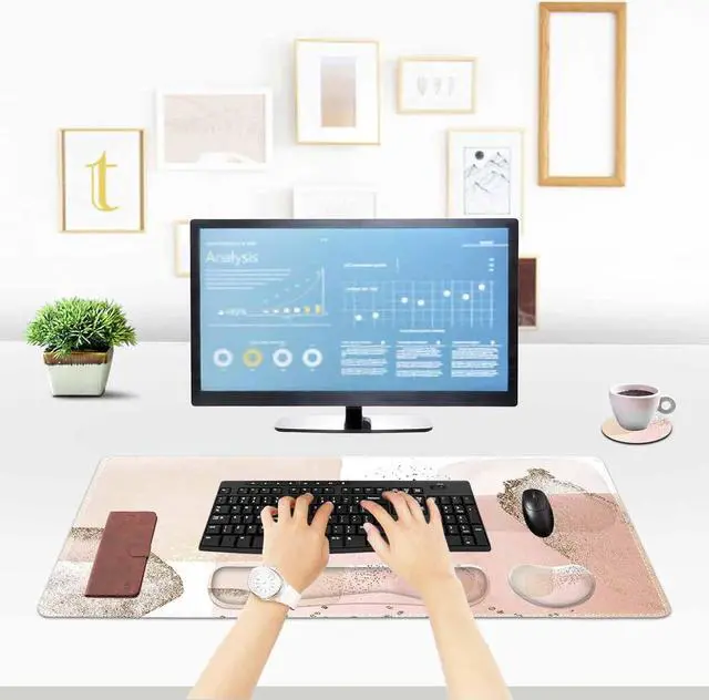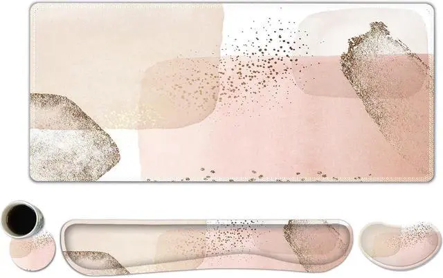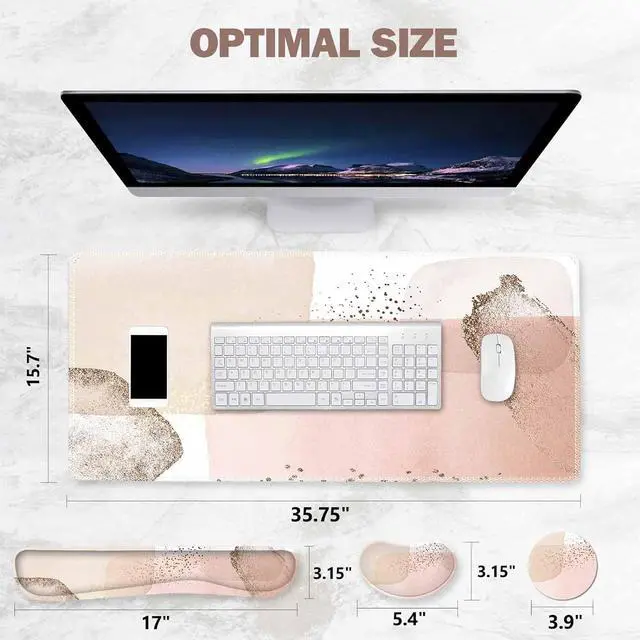 4 in 1 Mouse Pad SetErgonomic mouse pad includes desk pad (35x 15.5 inch), keyboard wrist rest( 17.3 x 3.3 inch), mouse wrist rest( 5.4 x 2.9 inch), cup coaster( 3.9 x 3.9 inch). It will fit perfectly on your desktop, providing ample space for mobile operation of keyboards, mice, tablets and laptops. Helps enhance the gaming experience or office productivity.