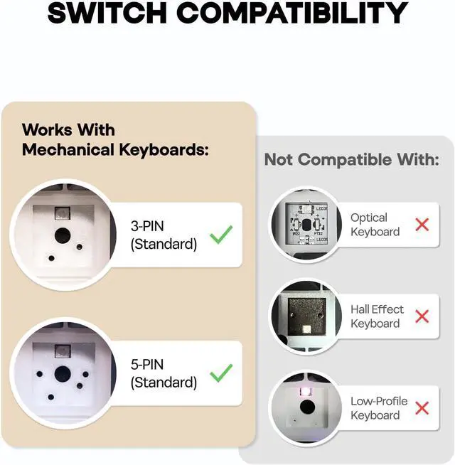 Compatibility Reminder: The EPOMAKER Silent mechanical switch is compatible with most mechanical keyboards available on the market. However, it is incompatible with low-profile mechanical keyboards, optical mechanical keyboards, and magnetic mechanical keyboards.