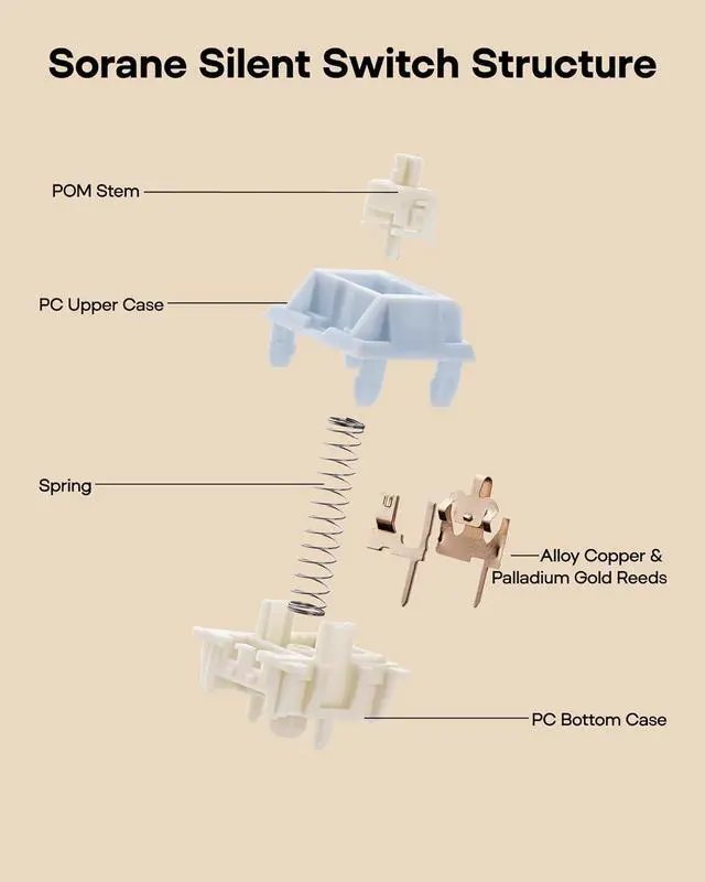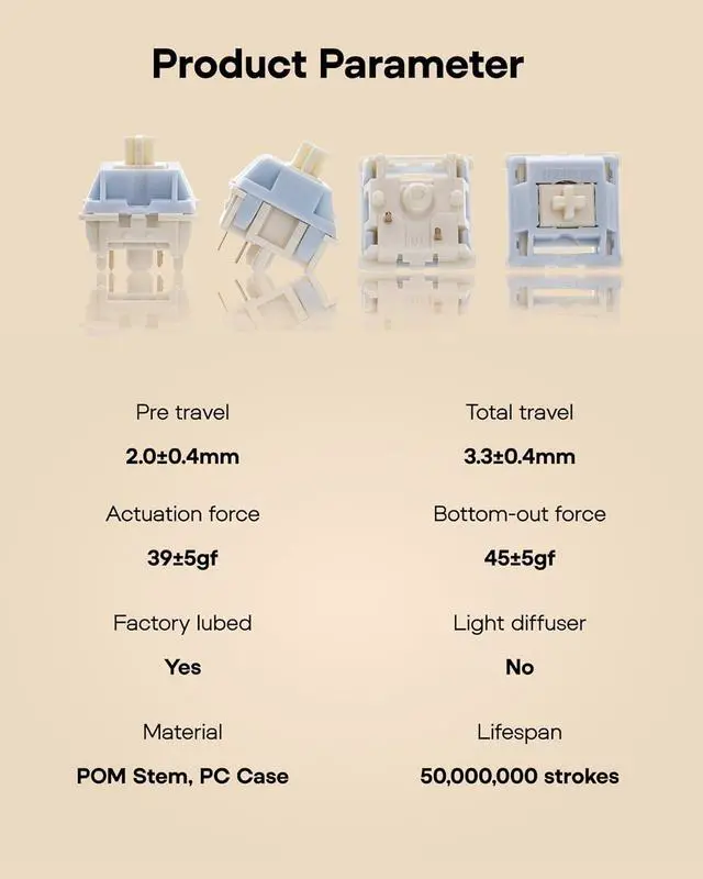 Worry-Free Performance: Pre-lubed at the factory and engineered with a specialized structure, the Epomaker Silent Switch self-lubricates with every keystroke. Its self-lubing mechanism relies on precision-machined grooves in the stem: with each press, these grooves evenly distribute the factory-applied lubricant across all moving componentsremoving the hassle of frequent re-lubrication entirely. Crafted from high-grade POM, the stem delivers exceptional wear resistance, maintaining its shape and ultra-smooth feel even after 50+ million keystrokes.
