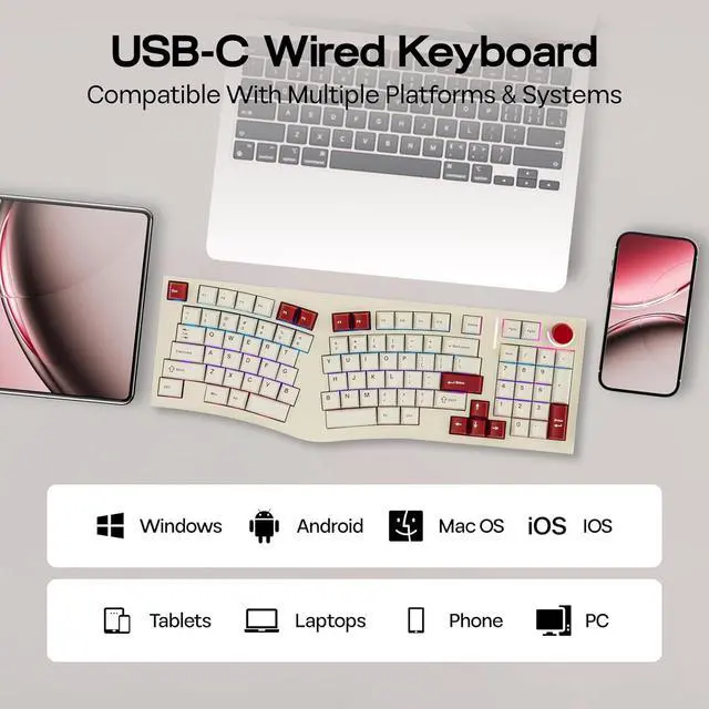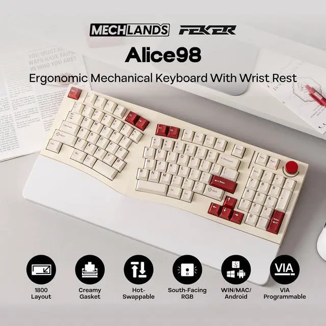Ergo Alice Layout with a Numpad The Feker Alice98 VIA Keyboard combines the beloved ergonomic Alice layout with the added functionality of a numpad, making it perfect for users who need both comfort and versatility. The Alice layout is designed with angled keys to align with the natural position of your hands, enhancing typing comfort. The split spacebar accommodates this ergonomic design, while a media control knob adds extra convenience. This layout allows your hands to rest naturally, reducing strain during extended typing sessions, all while maintaining the full functionality of a traditional keyboard.