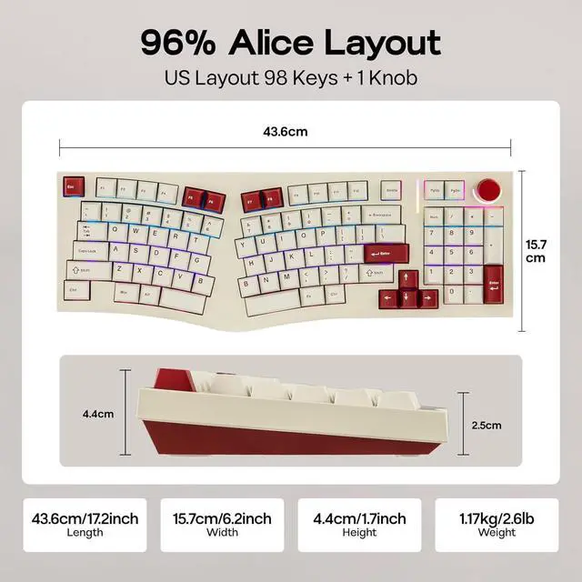 Cherry Profile Dye Sublimation PBT Keycaps The Alice98 Keyboard comes with 5 Sides Dye Sublimation PBT keycaps in Cherry profile, known for their fine texture and clear legends. PBT material is more durable and wear-resistant compared to ABS, preventing the keycaps from becoming oily and ensuring a comfortable typing experience.
