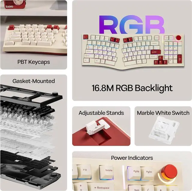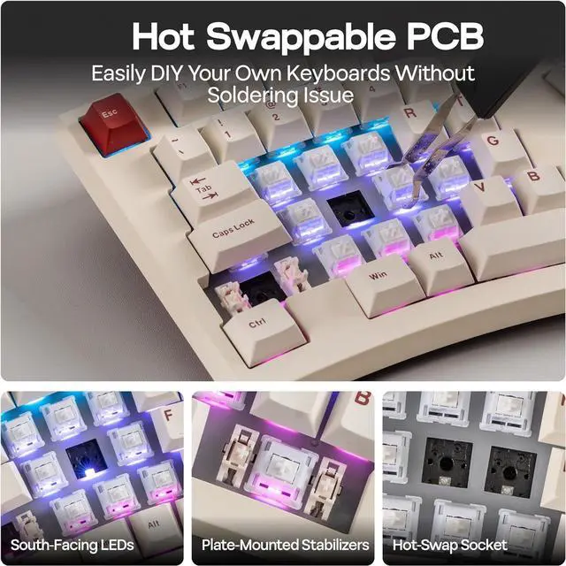 South-Facing RGB Backlight & Hotswappable PCB The Feker Alice98 keyboard is equipped with south-facing RGB LEDs, providing 21 customizable lighting effects that light up your desktop. The hotswappable PCB allows you to easily swap out switches without soldering, providing endless customization possibilities. The keyboard is also fitted with lubed plate-mounted stabilizers, making it easy to modify for a personalized typing experience. Additionally, the keyboard supports NKRO, ensuring that every keypress is registered, even during fast typing.