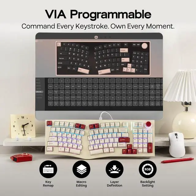 VIA Programmable The Feker Alice98 programmable keyboard is compatible with VIA, offering you complete control over your keyboards functionality. With VIA support, you can easily remap keys, create custom macros, and set up complex key combinations tailored to your workflow or gaming needs. This high level of customization allows you to personalize every aspect of your typing experience, ensuring that the keyboard adapts perfectly to your preferences. Whether you' re a professional user or an enthusiast, the Feker Alice98 provides the flexibility and versatility needed to enhance your productivity and enjoyment.