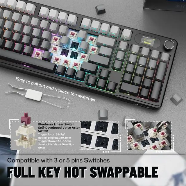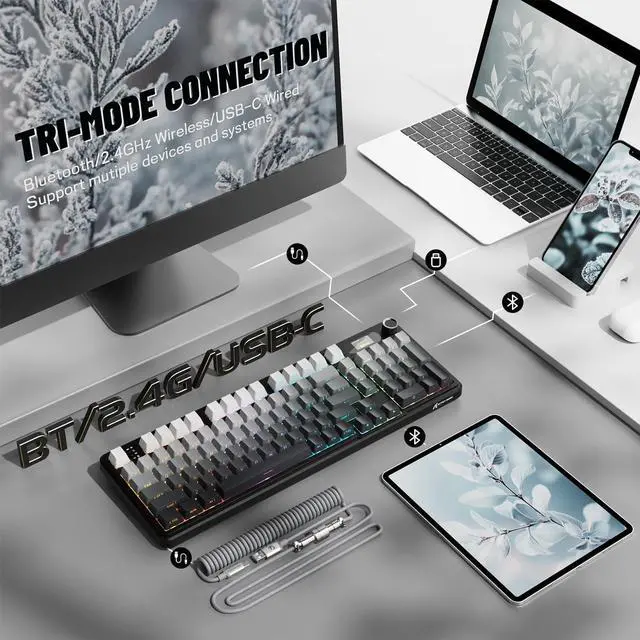 Tri-Mode Connectivity & Hot-Swappable Switches Seamlessly switch between Bluetooth 5.0, 2.4G wireless, and USB-C wired modes for the ultimate flexibility. Whether you' re gaming on Windows, designing on Mac, or coding on Linux, connect without limits. The hot-swappable PCB lets you easily swap between 3-pin and 5-pin mechanical switchescustomize your typing feel without soldering!
