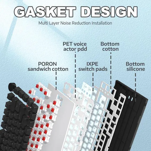 Gasket Mounted Mechanical KeyboardThe 75% mechanical keyboard uses a gasket-mounted design coupled with a Flex-cut PC plate, built-in 5 layers of sound insulation cotton, Poron sandwich cotton, IXPE under-axis pad, PET premium sound pad and bottom cotton, Noise is maximally reduced, The 1.2 mm PCB board slot and the PC positioning board slot optimize resilience and stability, making the hand feel softer and more elastic.