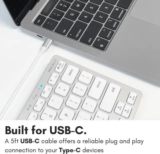 USB-C: Simply connect the 5 ft cable of our Type C keyboard to any device equipped with a USB C port, such as a MacBook, iPad, PC, or iMac.