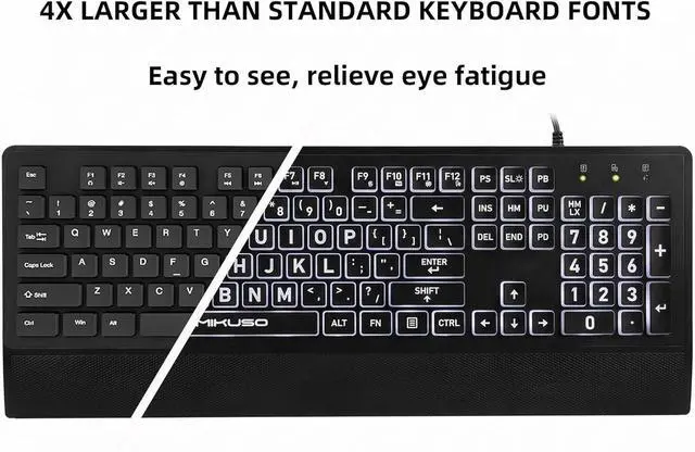 LARGE PRINT BACKLIT KEYBOARD: Light up Large key Keyboard features an oversized font design, clear and easy to find, 4X larger than standard keyboard fonts, it can really help those who have trouble seeing keyboards. The High-Contrast Yellow keys reduce eye strain by 50%., ideal for seniors, students, office workers, and those with visual impairments