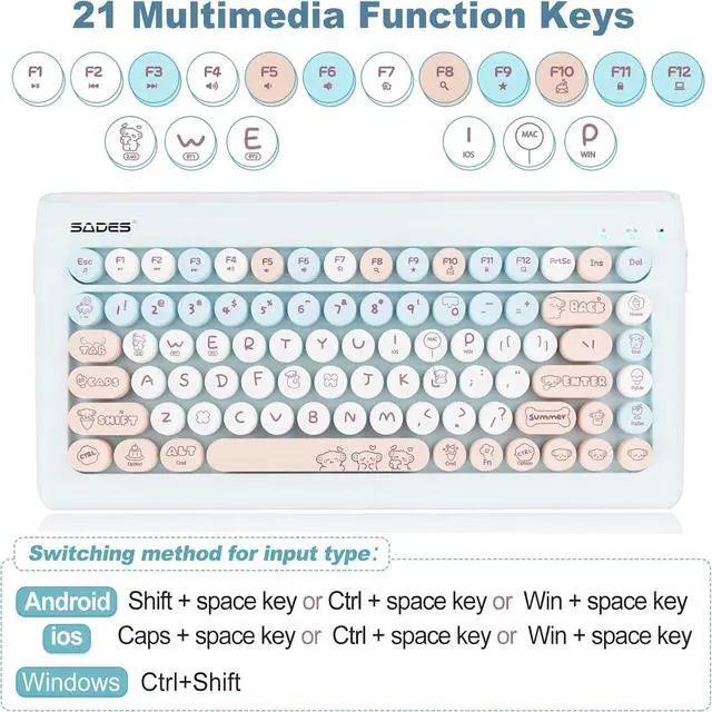 Bluetooth & 2.4G USB Wireless Triple Mode ConnectionThe lastest bluetooth 5.0 + 3.0 technlogy provides cable free&clutter-free connecton at the same time, operating distance of 33FT (10M) without delay. 2.4G Wireless Mode for desktop laptop PC without Bluetooth function, plug and play without installing any software or driver, ensures a stable and reliable connection. This cute bluetooth keyboard offers rapid response, zero latency, and delightful tactile feedback with each keystroke.