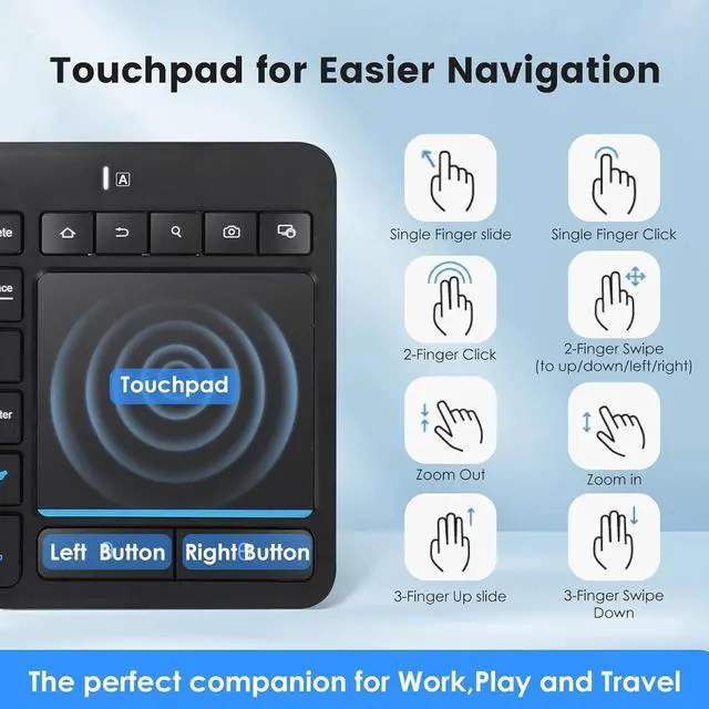 TWO-IN-ONE KeyboardThe wireless keyboard touchpad is a multi-use keyboard that can work with your laptops, phones, tablets, computers. Features a multi-touch trackpad to provide effortless navigation. Available gestures to achieve pointing, zooming and scrolling function. Give you an integrated and cozy control of your daily office work and HTPC entertainment, and record your inspiration anytime.