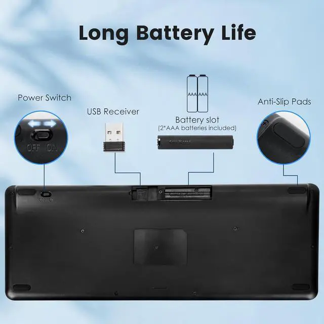 Power-saving & Auto-sleepWhen the wireless compact keyboard is not used for more than 30 minutes, the keyboard will automatically enter the sleep mode and the indicator light will go off, please press any key to wake up. Energy-saving feature can extends battery life. Inactive within 30 minutes and press any key to wake up. (Note: Need to press the Fn key at the same time to lock the touchpad. )