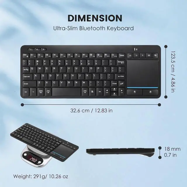 Ultra-slim and DurableOur wireless keyboard with touchpad made of premium ABS, which is wear-resistant and words are not easily worn away. Ergonomically designed smart keyboard, lightweight and portable. Compact key layout, it is not only has the commonly used buttons in Zone 1, but also retains the direction buttons, which greatly saves space. Easy to carry around. Perfect for office work, travel, library, etc.