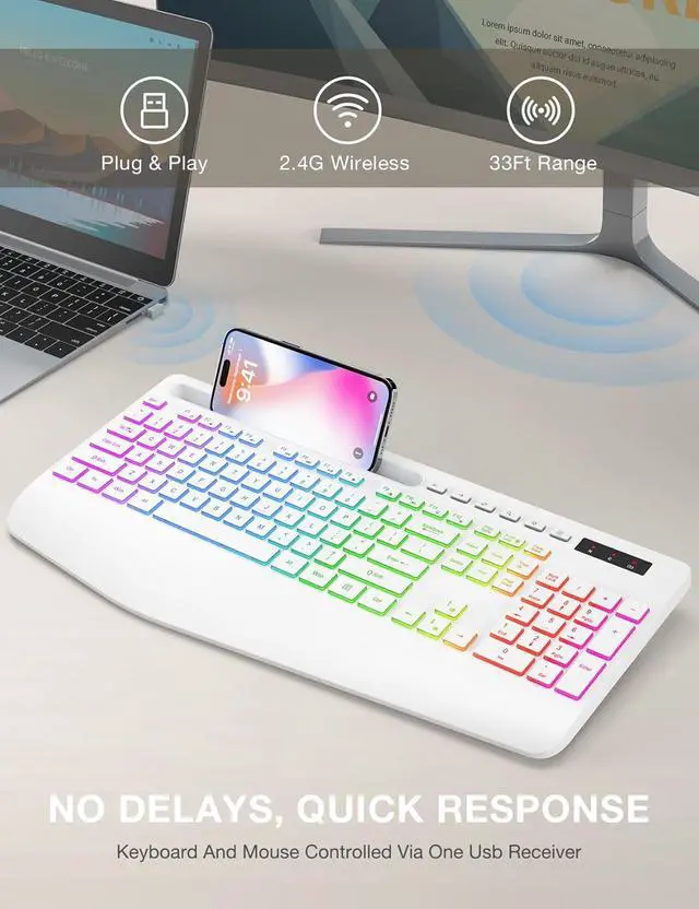 Ergonomic Wrist SupportOur ergonomic keyboard is equipped with a 2.8 " widest edge wrist rest, which increases wrist support by 54%, reduces stress on hands and wrists. Perfect for office workers or gamers who need to use the keyboard for long periods of time.