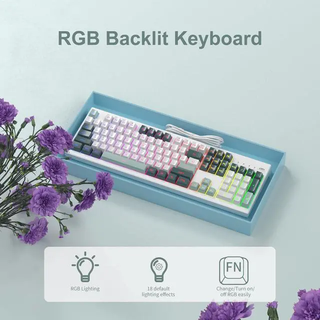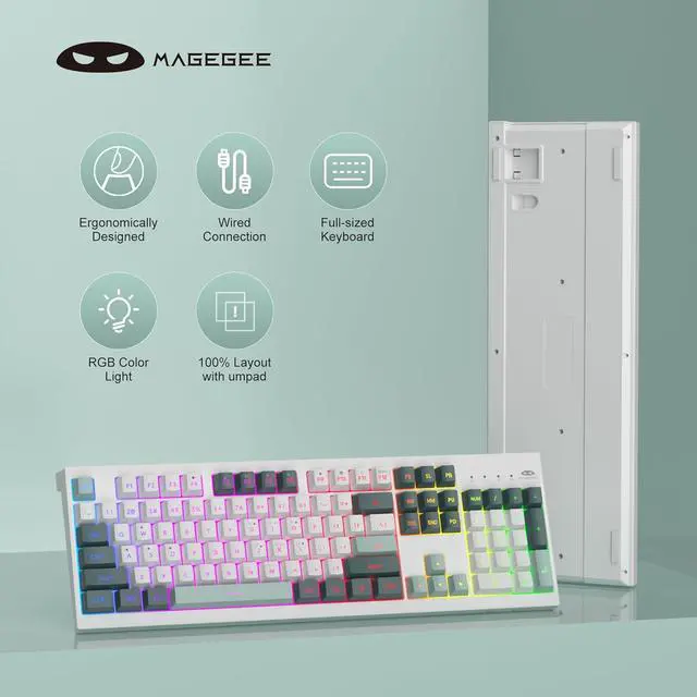 RGB Lighting Keyboard and Mouse ComboMageGee blue white keyboard with cool RGB lighting. Double Injection Keycap provide crystal clear uniform backlight and ergonomic curves, more advanced technology, clearer fonts and better light transmission. The bottom of the keyboard is designed with a foldable bracket, choose the height you need!