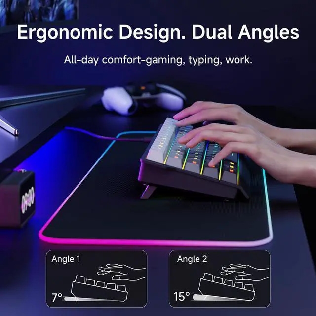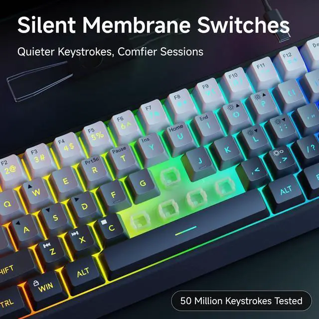 Ergonomic design and mechanical feel: This 60% mini keyboard features an ergonomic design that fits perfectly to your fingertips, ensuring comfortable extended use. Advanced mechanical-like technology provides a satisfying typing feel while maintaining the quietness of a membrane keyboard. Its compact size and powerful feel make gaming easier
