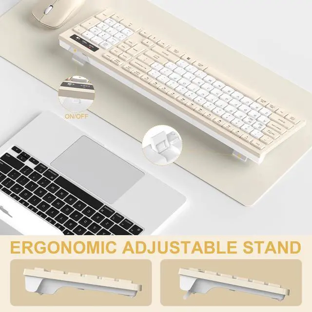 Quiet & Type in ComfortWireless keyboard come with adjustable height tilt legs to increase comfort and prevent your wrists injury when typing for a long time. Our wireless keyboard adopts a silent structure. Soft membrane keys provide a quiet and comfortable typing experience. The wireless mouse is quiet without any clicking sound also. So whether at home or in the office, you can use this combo as you please without worrying about disturbing others.