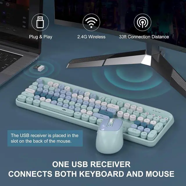 Wireless Connection: Keyboard and Mouse are connected via 2.4GHZ USB port, Plug and Play USB receiver provides long distance stable and latency free connection, 2.4G wireless connection ensures your office comfort.