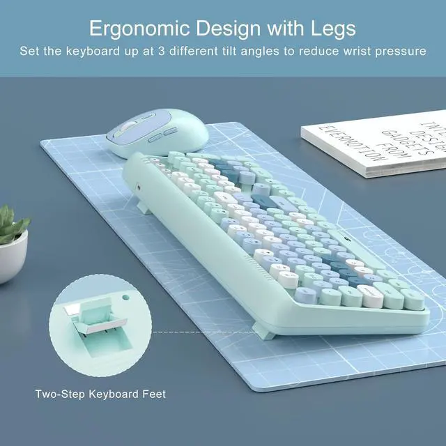 Ergonomic & Quiet Typing The keyboard features a -7° tilt and round keycaps that naturally position your wrist, reduce shoulder strain, and deliver whisper-quiet keystrokes for ultimate comfort.