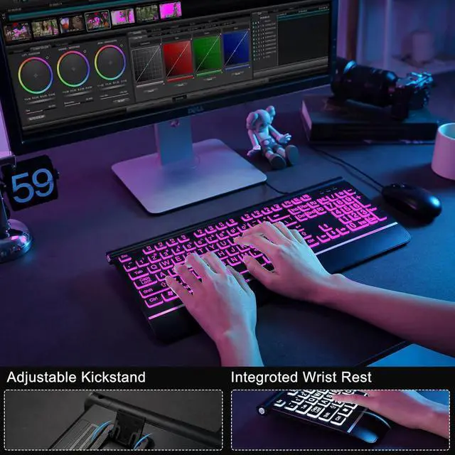 Adjustable 7 Color Backlight Lighting- The wired keyboard has a colorful backlit design. You can choose your own brightness and lighting kind with its 3 brightness levels and 7 color options, depending on your preferences. You can choose from blue, green, red, cyan, purple, yellow, and white. Choosing your favorite keyboard setting and take your desk setup to the next level.