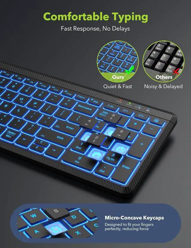 COMFORTABLE TYPINGThe wireless bluetooth keyboard' s slightly concave keycaps are designed to fit your fingers perfectly, reducing force and relieving your finger aches and pains due to long hours of typing, Same time, waterproof & dustproof, Spill Resistant.