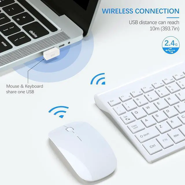 Stable 2.4G Wireless ConnectionPowerful and reliable connection of wireless keyboard mouse is up to 10 m( 393.7 in). Wireless keyboard with mouse combo share a Nano receiver (stored at the bottom of the mouse) without installing any additional software, plug and play. Keep your desk clean and tidy.
