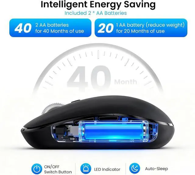Long-Lasting Battery Life & Auto Sleep Function2 AA batteries are installed in the mouse. Engineered for endurance with an impressive 40-month battery life(This varies according to the environment in which it is used. ), this wireless mouse is compatible with a wide range of devicesincluding Computer, Desktop, PC, Mac, Phone, Laptop, Tablet, and even devices running Windows, macOS, Chrome OS, Linux, and iPadOS. The smart auto sleep function kicks in after just 5 minutes of inactivity, conserving energy until a simple click or movement instantly reactivates the mouse.