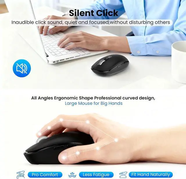 Ergonomic Design for Comfort & Back/Forward ButtonsCrafted for the Right hand and all-day comfort, the ergonomic shape of the Wireless Mouse ensures a secure and fatigue-free grip. It' s perfect for extended work sessions, minimizing hand strain while maximizing productivity. Back/Forward buttons make moving quickly forward or back between documents or browsing websites a breeze, enhancing your workflow and browsing efficiency. This mouse is suitable for medium-large hands.