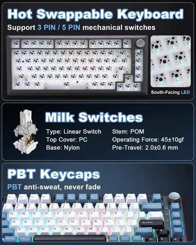 Hot-Swap Wireless KeyboardEffortless Customization, Unlock the world of mechanical switches with easy hot-swappable sockets (compatible with most 3-pin and 5-pin switches). No soldering neededinstantly swap switches to find your perfect tactile feedback. It' s the ideal platform for both first-time builders and seasoned modders