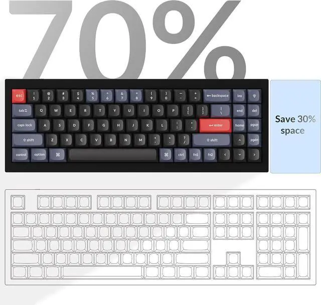 Saving Space: The Keychron Q7 features a 70% layout that retains all essential function keys while significantly reducing its footprint. This design frees up valuable desk space for mouse movement and a cleaner setup, making it ideal for compact workspaces or users pursuing a minimalist desktop.