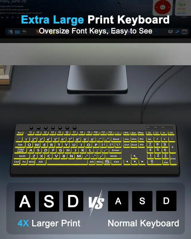 Large Print Keyboard4X larger than standard wired keyboard fonts, clear and easy to find. Alleviate your eyes, reduce typing errors, ideal for elderly, the visually impaired, students, special needs departments and libraries, etc.