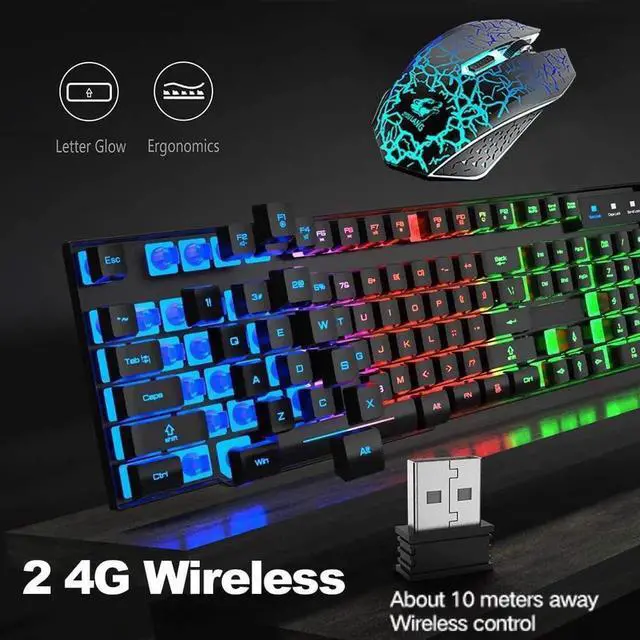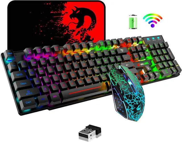 Wireless Gaming Keyboard and Mouse, Rechargeable Rainbow Backlit Keyboard Mouse with 3800mAh Battery, Mechanical Feel Gaming Keyboard, 7 Color Gaming Mute Mouse, Gaming Mouse Pad for PC Gamers