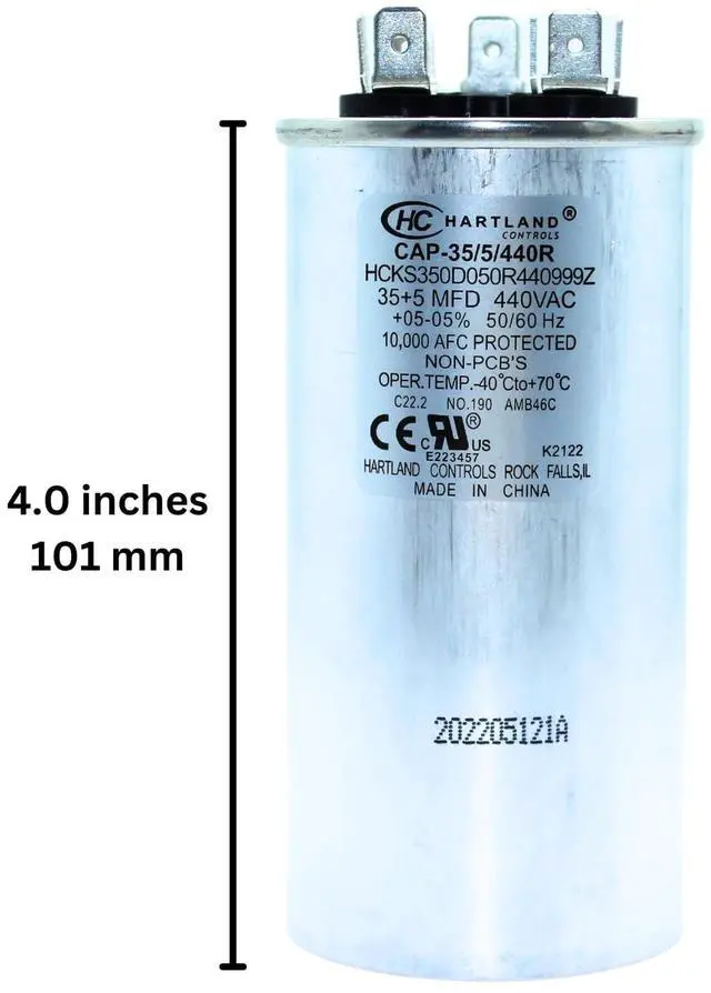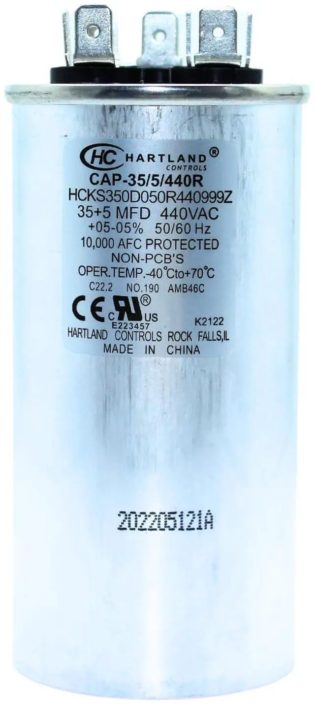 A capacitor is an electric component that temporarily stores an electrical charge. A "run capacitor" supports electric motors, such as in air conditioner or heat pump units, a fan motor and a compressor motor. The capacitor has two terminals. Capacitors come in a variety of sizes, depending on the capacitance (µF or MFD), such as 40 plus 5 µF, and also the voltage. A 440 volt capacitor can be used in place of a 370 volt, as it is build better, but the 370 cant be used in place of a 440 volt. It will work for a while and will fail prematurely, as exceeding the capacitor's rated voltage will cause the dielectric to break down and the capacitor to short out. Same as an electric wire- 600V rated wire is better than 300V one .The capacitance(µF or MFD) must be the same or stay within 10%+ or 5%- of its original value . Example: 50 µF cap can be substituted by 47.5 to 55 µF with the same or better voltage ratings capacitor . Round oval-shaped run capacitors are commonly used for air conditioning, to help in the starting of the compressor and the condenser fan motor.