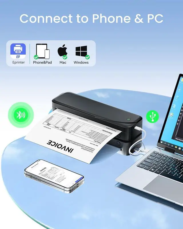 Seamless Bluetooth Connectivity: Experience quick and hassle-free printing with our user-friendly portable printer. This wireless printer allows you to print from anywhere in just a few seconds, catering to the needs of both students and business professionals whether at home or outdoors. The portable printer is Bluetooth compatible with iPhone, Android phones, and iPads. It can also connect to laptops or desktops via USB-C for printing. (Note: Bluetooth only supports mobile phones and tablets, not laptops or desktops.)