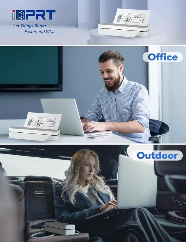 PORTABLE WIRELESS PRINTERiDPRT MT888 Mobile Bluetooth Printer is a portable wireless printer, weighing only 2 pounds, with a size of 12.2 inches x 2.5 inches x 1.56 inches, very light and portable, and can be easily put into a handbag or briefcase. It can print anywhere to meet the user's various printing needs, whether it is travel, business trip, school, car, home or office, it is a reliable companion.