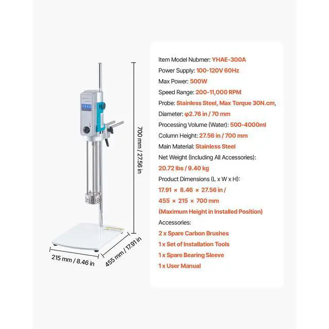 Homogenizer, 500 W Laboratory High Speed Dispersing Homogenizer, 200-11000 RPM High Shear Lab Mixer Emulsification Machine, Digital Display Blender, Stainless Steel, for Cosmetics/Food Industry