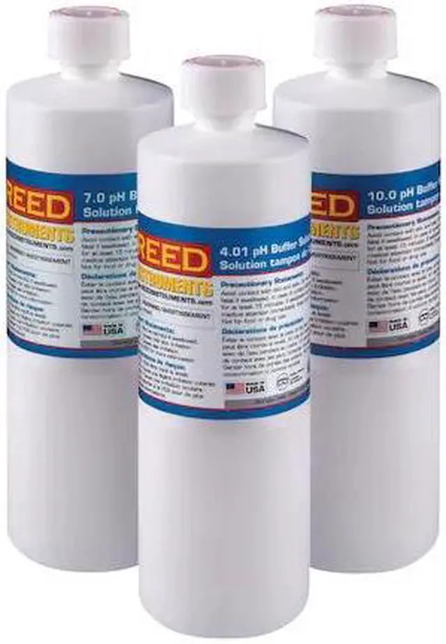pH Buffer Solutions in 16.9 oz (500mL) bottles for electrode calibration and care. Color-coded for easy identification. Kit includes 4.01, 7.00 and 10.00 pH.