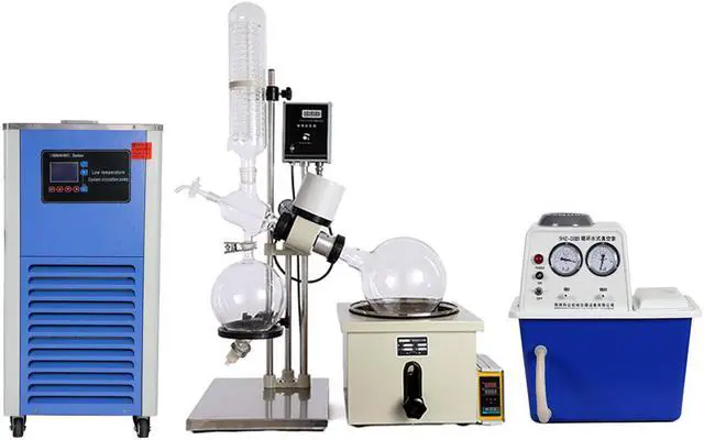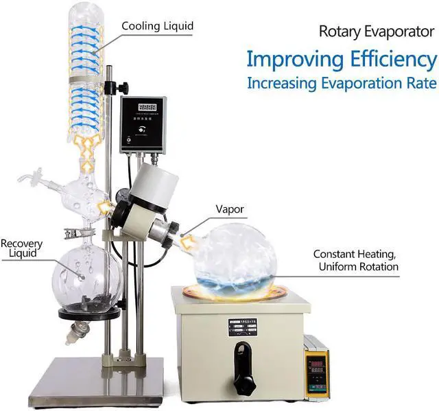 Rotary evaporators are distillation units that incorporate an efficient condenser with a rotary flask system. As the flask containing the solvent is rotated it continually transfers a thin layer of liquid over the entire inner surface. This gives a very large surface area for evaporation that is effected by heating from the accessory water or oil bath. The solvent steam is cooled by a high efficiency glass condenser and recovered in the collection bottle, which greatly improves the evaporation efficiency, especially for the concentration and purification of the biologic which are easily decomposed at high temperature.