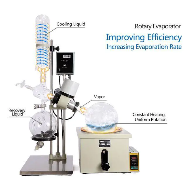 Rotary evaporators are distillation units that incorporate an efficient condenser with a rotary flask system. As the flask containing the solvent is rotated it continually transfers a thin layer of liquid over the entire inner surface. This gives a very large surface area for evaporation that is effected by heating from the accessory water or oil bath.