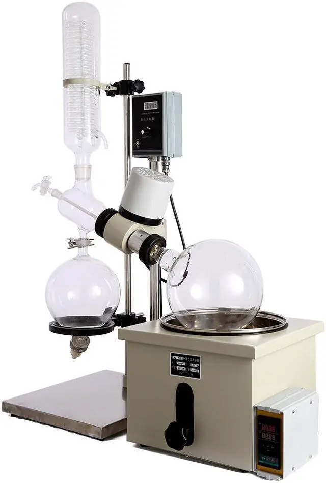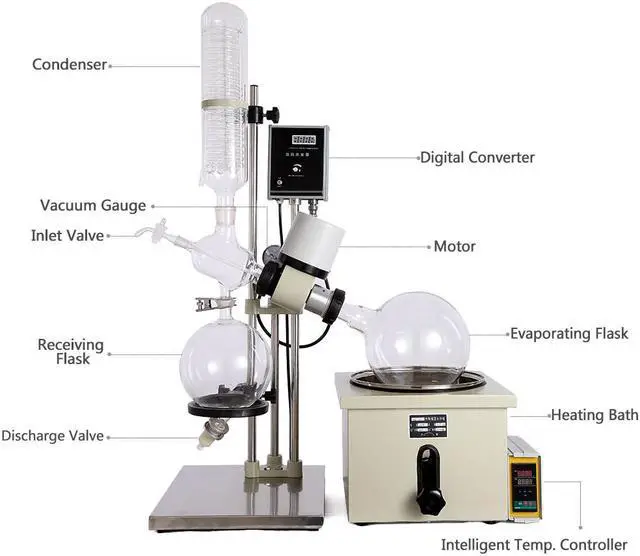 Rotary evaporators are distillation units that incorporate an efficient condenser with a rotary flask system. As the flask containing the solvent is rotated it continually transfers a thin layer of liquid over the entire inner surface. This gives a very large surface area for evaporation that is effected by heating from the accessory water or oil bath.