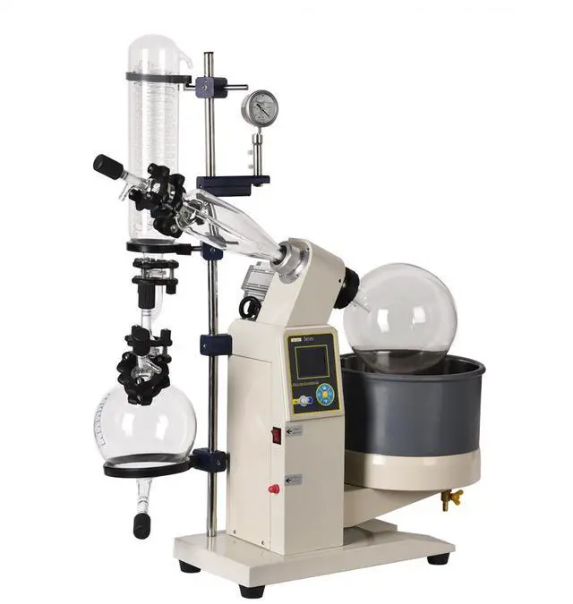 Rotary evaporators are distillation units that incorporate an efficient condenser with a rotary flask system. As the flask containing the solvent is rotated it continually transfers a thin layer of liquid over the entire inner surface. This gives a very large surface area for evaporation that is effected by heating from the accessory water or oil bath.