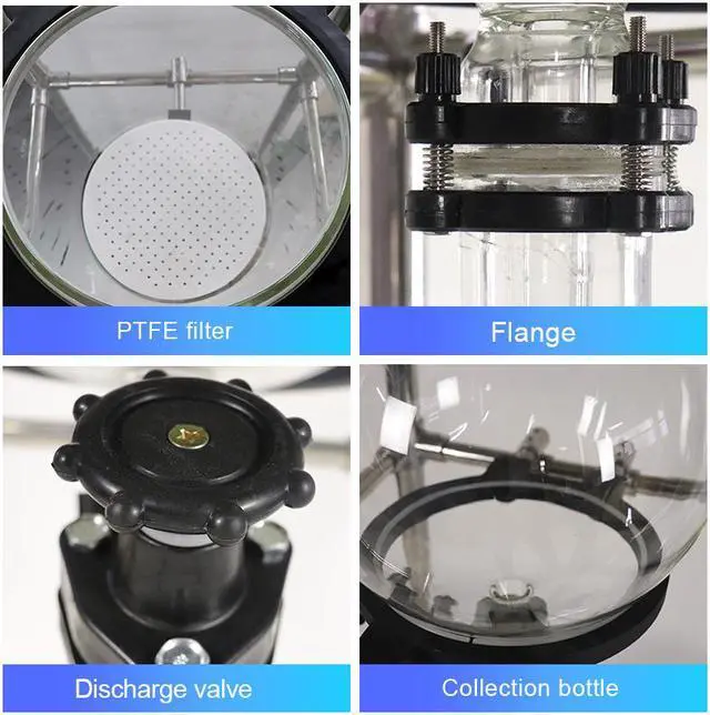 - Glass funnel, PTFE Orifice plate, good chemical performance, visible fitering process.