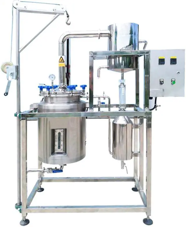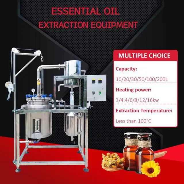 The essential oil extraction equipment is suitable for the common water and water-proof distillation extraction process of the conventional oils in plant branches, flowers, grasses and animal materials with higher oil content, and the aromatic oils are placed in the distillation container. Pass high-temperature steam into it or put spices and water together to boil, then the essential oils containing aromatic components in the plant will diffuse into the water vapor to form an azeotrope of oil and water; then the azeotrope Cooling, because the oil is insoluble in water, the oil is separated out through the oil-water separator.