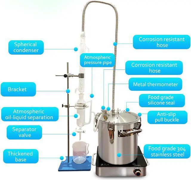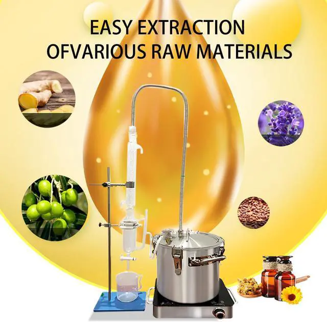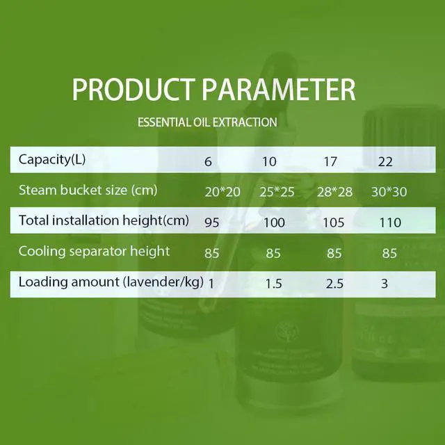 1. Food grade 304 stainless steel steaming bucket The steaming barrel made of food-grade 304 stainless steel has good corrosion resistance and heat resistance, so that the essential oil we extract is more pure; the barrel body uses a wire drawing process to make the equipment beautiful.