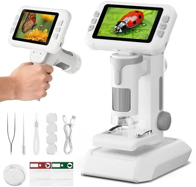 3-IN-1 MULTI-FUNCTIONAL & 6 ADJUSTABLE LED: This 3-in-1 microscope features a detachable design for hassle-free switching between desktop, handheld, and portable modes. Enjoy stable viewing on the desk, share discoveries easily with the handheld unit, or take the compact portable mode on outdoor adventures. Built-in 6 LED fill lights with 3 adjustable brightness modes, maintaining optimal visibility even in low-light conditions.