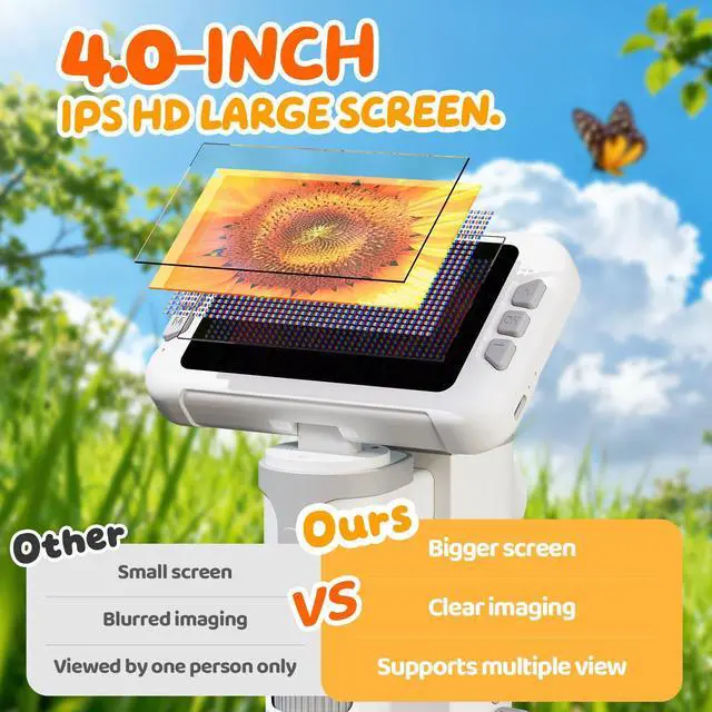 4.0-INCH LARGE SCREEN & 1080P HD CAMERA: The microscope for kids have a large 4.0-inch IPS screen, delivering bright and clear images that bring rich microscopic visuals to life in real time, enhancing an immersive observation experience. With its built-in 48MP 1080P camera, children can easily capture high-definition photos and videos of all their discoveries.