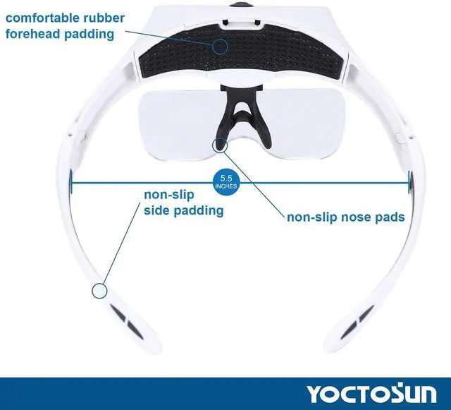 The YOCTOSUN Magnifying Visor with four LED Lights, wholly rubber wrapped nose bridge and newly designed spectacle frame is much more comfortable for seniors, hobbyists and professionals to wear. Perfect LED Head Magnifier for hands-free application like sewing, knitting, diamond painting, Jigsaw puzzles, cross stitch, esthetician
