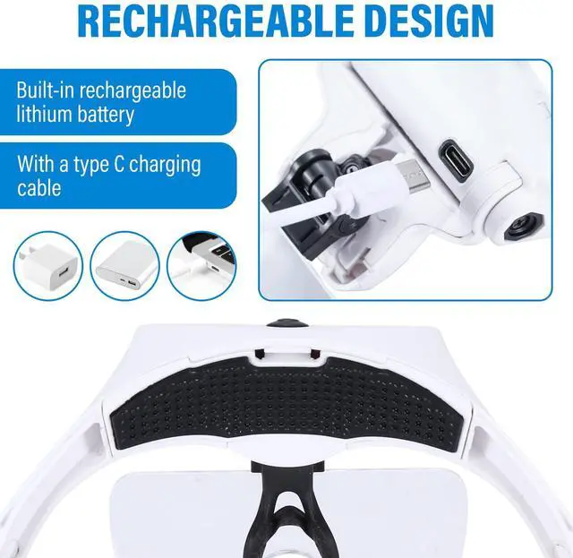 Equipped with a rechargeable built-in lithium battery and comes with a USB Type-C cable, simply plug the cord into the head magnifier and the other end into the slot of a USB power source(such as a USB wall charger, a cell phone charger or a power bank, not included) and it automatically charges. Save money and energy while enjoying long lasting bright light. You will never need to buy batteries again!