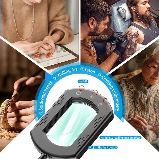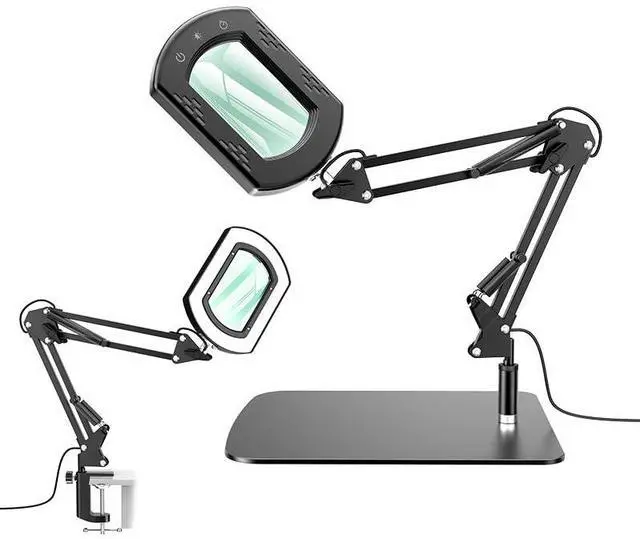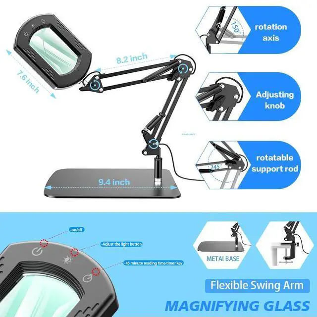 MultiAngle Swing Arm with 150°/245° Rotation Customize your viewing angle with a flexible metal swing arm and dualrotation lamp head. Maintain a stable, handsfree setup for precision activities like soldering, jewelry making, and stitching.