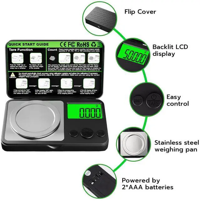 Tare Function for Easy Net Weight: Quickly reset the scale to zero with the TARE button, allowing you to deduct the weight of containers or measuring cups. This makes it perfect for accurate weighing of small items like gold, diamonds, or powder, ensuring precision every time.