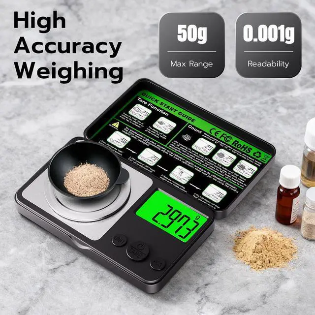 Precise Measurement for Every Need: This digital scale offers ultra-accurate weighing with a maximum capacity of 50 grams and a readability of 0.001 grams. Switch between 7 weighing units (g, oz, ozt, dwt, ct, tl, gn) with the press of a button to suit various tasks, whether for food, jewelry, or medicinal herbs.